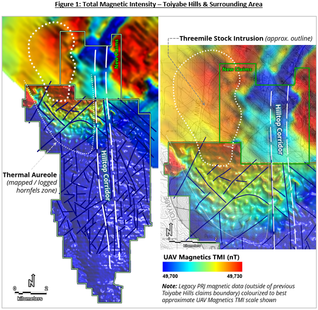 At the end of the 2025 field season, MWH Geo-Surveys International Inc. of Reno, NV (“MWH”) completed a Property-wide drone magnetic survey, flown at 50-metre line spacings and an average altitude of 48 metres. The data acquired were then processed and analyzed by Mr. Jim Wright of J.L. Wright Geophysics in Spring Creek, NV, a renowned geophysicist with over 40 years of expertise within the Carlin and Cortez Districts of northern Nevada. The major findings included an interpreted deep-seated igneous stock near the northern boundary of Toiyabe Hills, intruded into the footwall of the Hilltop Corridor. Observations consistent with a thermal aureole – evidently, the peripheral effects of the Threemile Stock – had previously been made by the Company at the Property, with hornfels alteration mapped at surface and logged in nearby drill holes. Figure 1 below shows total magnetic intensity (TMI) and combines 2025 MWH magnetic data with inherited legacy data collected via fixed-wing surveys in the 1980s and 1990s by Pearson, deRidder and Johnson (“PRJ”) of Lakewood, CO. A step-out drone magnetic survey by MWH – to be completed imminently – will improve upon the legacy PRJ data to the north and more precisely define the dimensions and character of the Threemile Stock.