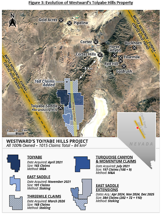 With results from the 2025 drone magnetic survey in hand, the Company identified additional available ground proximal to the Threemile Stock and along strike of the Hilltop Corridor. As soon as weather conditions allowed, 168 unpatented mining claims administered by the U.S. Bureau of Land Management (“BLM”) were staked; Westward’s 100%-owned fully-contiguous land position is now comprised of 1,015 claims covering approximately 84 square kilometres (see Figures 3 and 4 below). These new claims are not subject to any underlying royalties or obligations with the exception of annual maintenance fees payable to the BLM and Lander County.