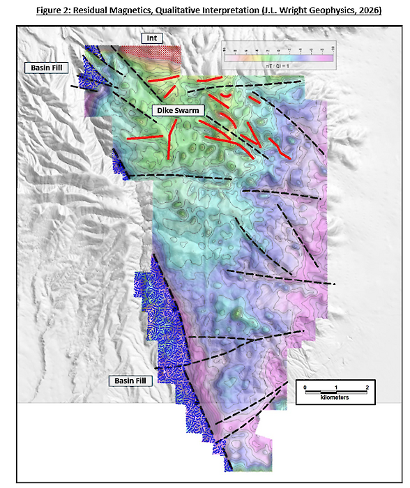 Property-wide drone magnetic survey flown at the end of 2025 indicates a buried intrusive centre near the previous northern boundary of Toiyabe Hills